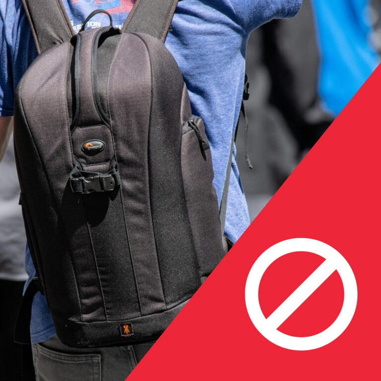 - Large bags/backpacks (items must be smaller than 12″ x 12″ x 7″), Larger items may be held with coat check during a performance